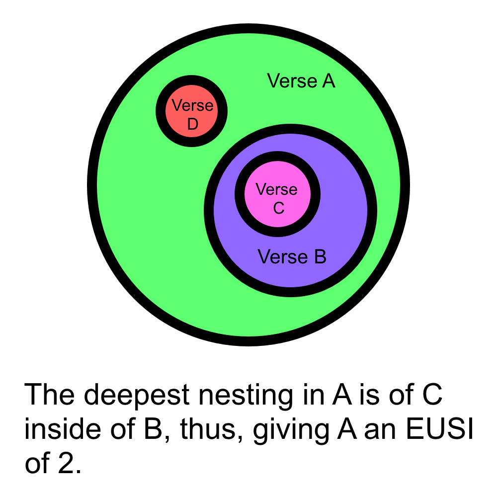 In the image located to the right, it is visible that Verse A contains Verse B which contains Verse C. Since Verse A contains the B, C chain, that means that the length of the chain is 2, and so the EUSI is also 2.