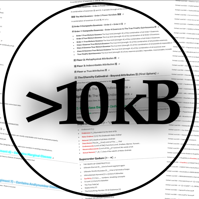 Note from Feesh: This page uses numbers from Beyond Ω, which I have kind of abandoned, and many people have made many edits. It may be discontinuous at times, with many, many voids with no numbers.